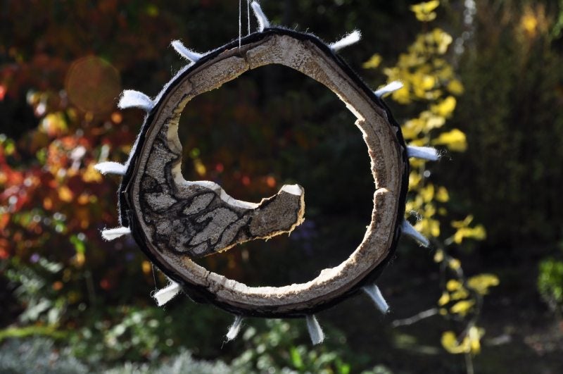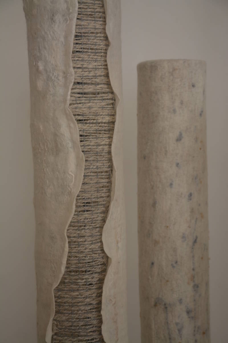 De vijf witte zuilen geven "mijn" element VUUR weer door middel van licht - houtskool en brandgaten.
